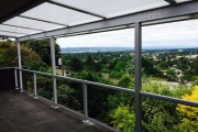 We removed the old aluminum patio cover and metal railing from this unusual cement deck and modernized everything. We installed a new Acrylite patio cover with white aluminum frame and cool blue heatstop dual wall acrylic roofing. The aluminum railing is made by Hansen rail and has 1/4″ tempered glass to avoid obstructing the view. We obtained plans and permits complete with engineering for this SE Portland project. It was aa nice improvement over the old worn out railing and patio cover they had.