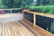 This nice deck uses tight knot cedar decking stained in a natural color. The railing is cedar with black aluminum balusters.