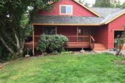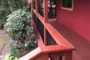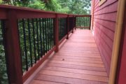 This deck is built with a beautiful tropical hardwood known as dark red meranti. It is just a beautiful as ipe or tiger wood but it is less expensive and also easier to install. It is a nice option for someone wanting the beauty of a hardwood deck but not wanting to spend the highest amount. It has been stained in Messmer’s natural hardwood formula stain. The red color that comes out in the wood is naturally occurring.