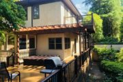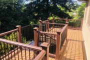 This deck has all the bells and whistles. We poured a large slab to support the hot tub, it has a spiral staircase to get from the top to the bottom deck, it has a second story balcony deck, a cedar pergola, Composite decking and lighting, plus wrap around fascia and access gates to the under side. The decking is Trex transcend Havana Gold with a Spiced rum border. The railing is Trex Transcend in vintage lantern color with round aluminum balusters in black. The cedar pergola is stained in Oxford brown. We got this one finished just in time so they could have a wedding on it that next weekend!