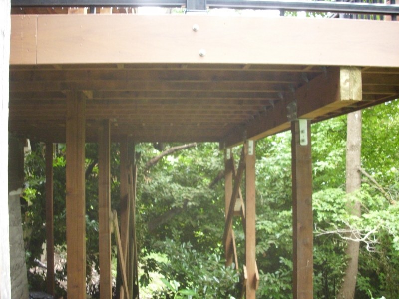 This deck replaced a much smaller one that was rotting out. At its highest point it was about 27′ off the ground. We had to install four foot deep footings and we also replaced the posts that supported the upper levels of the house because we discovered they were rotten when we disassembled the old deck. The material used here is Timbertech’s XLM series (PVC) decking in the color of Harvest bronze and the railing is Timbertech’s Radiance rail with lighted post caps. This is a beautiful deck that will impress anyone who visits the house.