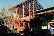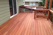 This was a nice project that kept us busy during our brief slow time of year. It uses sustainable farmed mahogany from Fiji for the decking and cedar with metal balusters for the railing. The roofing is made by Acrylite, its a high quality acrylic roof panel in a tint of grey. The railing is stained dark walnut and the decking is stained in the natural hardwood color. This is a really beautiful project!