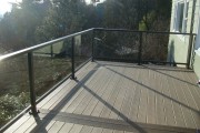 This deck has a great view so we removed the bulky railing it had, replaced the decking, and installed this modern glass railing. The decking is Timbertech Tigerwood with a mocha border and the railing is made by Hansen. It is all aluminum in the bronze color with glass panels. We also installed a Dryspace system underneath (not pictured).