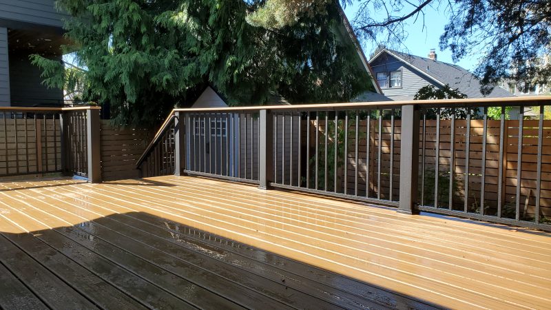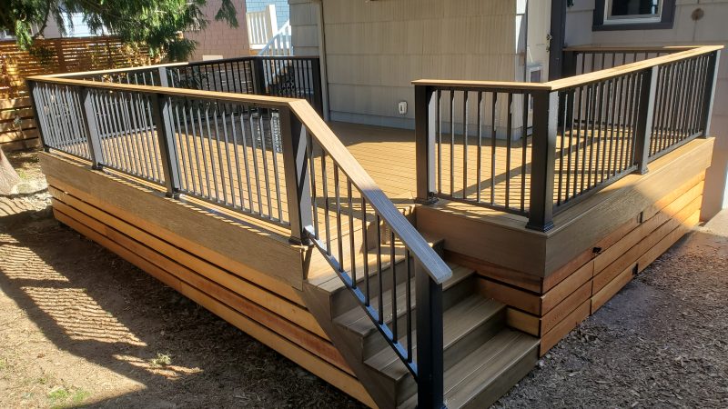 SE Portland – We used Trex Havana Gold decking for this deck. The railing has Trex Signature aluminum infill, with Trex Transcend composite posts, and a Trex Havana Gold “cocktail rail.” We wrapped the sides of the deck with clear cedar stained in natural color. Its a beautiful upgrade for their back yard!