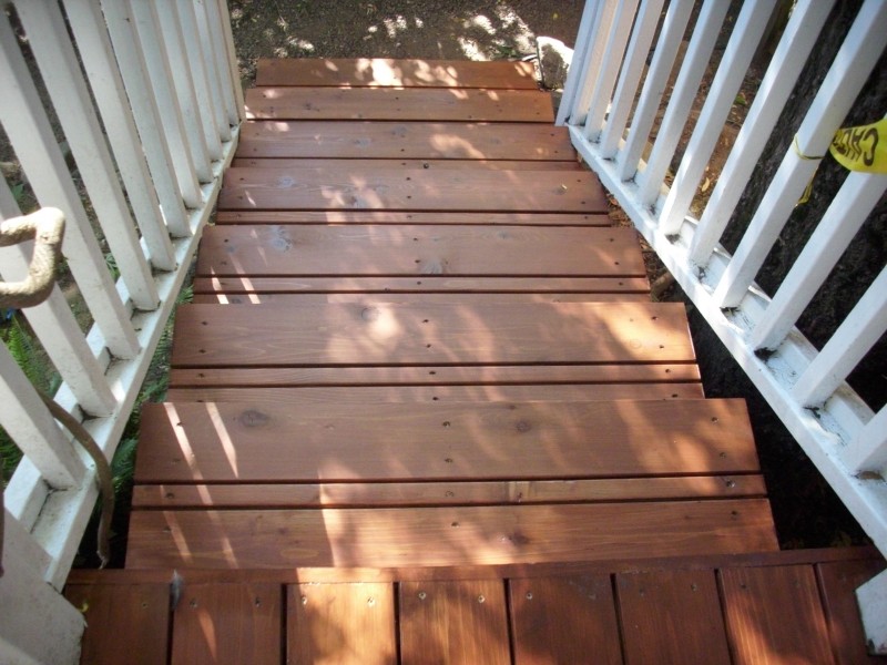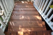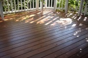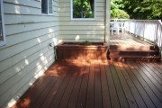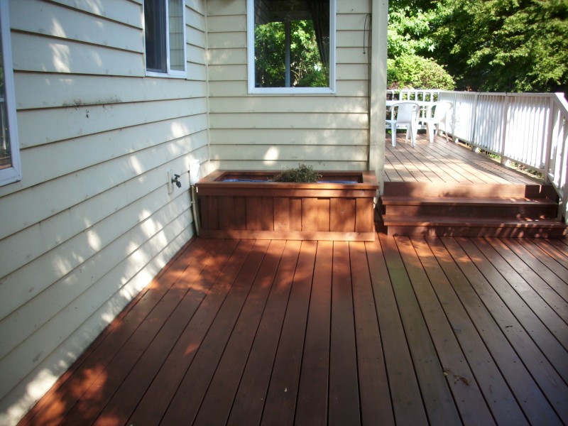 This customer had an old cedar deck that had holes in the decking because of rot. They were lucky however that the framing was pressure treated because we were able to reuse it. So we removed the old decking and replaced it with new cedar decking. In order to save money we also re-used the railing as it had been maintained well and was still structurally sound. We rebuilt the stairs completely and built a new flower box as well. We stained the project with Benjamin Moore’s Arbor coat stain in the color of Saddle leather brown. This is a two coat stain with a clear coat as the second coat. The advantage of this is that the customer can easily just add a clear coat each year to maintain the stain for years to come. It is also a low VOC stain which means it is much better for the environment. The result was impressive!