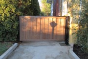 This is a very nice automatic opening clear cedar gate stained with Pittsburgh semi- transparent stain in the color Espresso. The gate itself has a custom welded and powder coated frame to keep it from sagging. It also has a heavy duty 6×6 metal post to keep the gate from leaning over. We poured a large footing for extra support and installed the Mighty Mule 350 gate opener. It comes with two remote controls so the owner can open the gate either from inside the house or from the car when they are getting close to home.