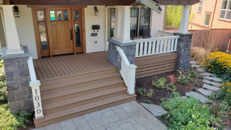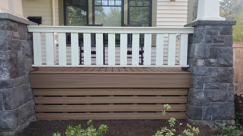 SE Portland – This project was a re-skin. They needed to replace the decking that came with the house and they decided on Deckorator’s Sedona color decking. We re used the railings as they were in good shape. We installed a skirt that hugs the contour of the stone columns and added an access hatch. Overall the customer was very happy with this fantastic upgrade to their front and back decks!