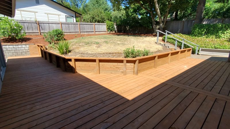 Lake Oswego – This deck and retaining wall were replacements for a rental house. The decking is pressure treated fir, brand name “Elite decking.” It should last 20 years and is an economical choice for replacing a deck.