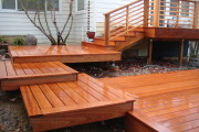 We built this Japanese style deck for an engineer. It has no mitered corners on the decking, the decking itself is an exotic hardwood called Red Meranti, and we stained the decking in a natural hardwood stain color. The railing is cedar, also stained in the same natural color. It reminds us of Frank Lloyd Wright’s , “Falling water, ” in that it resembles a gentle waterfall cascading down the hill. Its a very beautiful and interesting deck and will be a showcase of his back yard once his landscaping is finished.