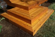 Stained cedar deck by Deckmasters | Cedar and pressure treated decks Stained cedar deck Cedar box step This is a nice standard issue cedar deck and railing with nice box steps. The stain is Messmer’s Natural cedar color oil based UV plus stain.