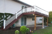 This nice deck has Trex Select Madeira color decking and a Trex Transcends railing with while balusters/ posts and vintage lantern color rails. On the under side of the deck we installed Timbertech’s Dryspace system to provide a dry area under the deck.