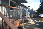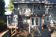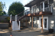 This project was a little different from what most Northwestern residents choose for their decking because this customer wanted the white stair risers. Trex makes this white fascia product and sells quite a bit of it in the Northeast part of America, but we usually use a fascia or stair riser that matches the decking. The color of this Trex decking is Lava rock and the railing is called Transcend rail. The color of this 42″ railing is vintage lantern with black balusters and white posts. This is a deck that will last a lifetime!