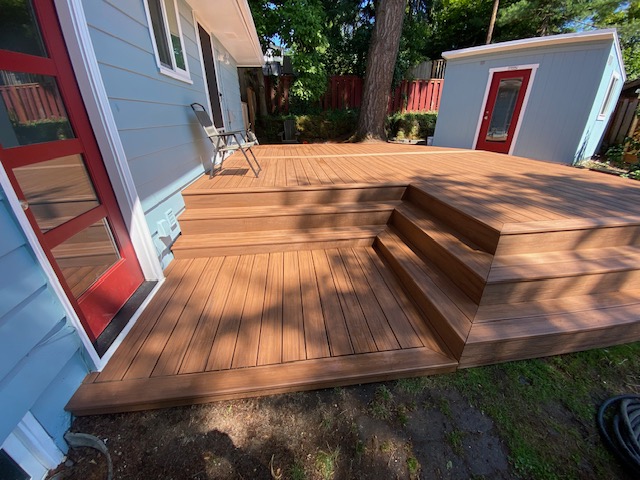 SW Portland – This customer had a cement patio behind their house and they wanted something nicer and up off the ground. We came up with this design to connect their house to their back studio. It brings the two buildings together making them a more cohesive whole and beautified the space at the same time!
