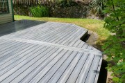 This deck is uses the new Trex island mist color. It has a very pleasing mix of greys with a slight hint of light blues mixed in. We think the color is a very nice addition to the Trex Transcend tropical line of decking. As we do on all decks, we use hidden fasteners (Trex hideaway in this case) for the decking and we also use full length boards, running an expansion gap down the middle to avoid any butt joints.