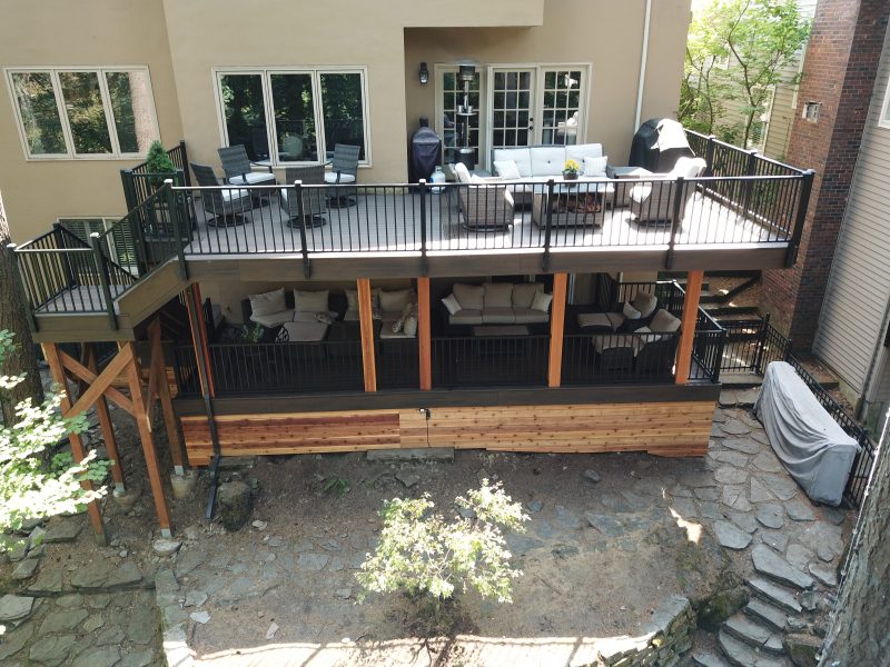 This is a really nice deck with several upgrades. The decking is Trex Spiced rum, the railing is a fascia mounted Trex Signature aluminum railing with post cap lights. We installed Trex Rain escape in the upper deck to create a dry area below then covered the ceiling with tongue and groove cedar stained in natural color. We had heaters and recessed lighting installed to make the space more useable in the winter months. We also wrapped the bottom deck in cedar fascia. This is a very classy deck that will last a lifetime!