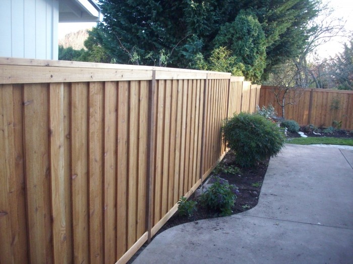 This is one of our favorite styles of fence. The fence boards are overlapped one inch on each side so that the fence doesn’t have gaps between the boards for a “true privacy” effect. It is also trimmed out on the top and bottom for a very nice look. This customer also opted to have the fencing pre-stained so that the wood is protected and has a nice color to it.
